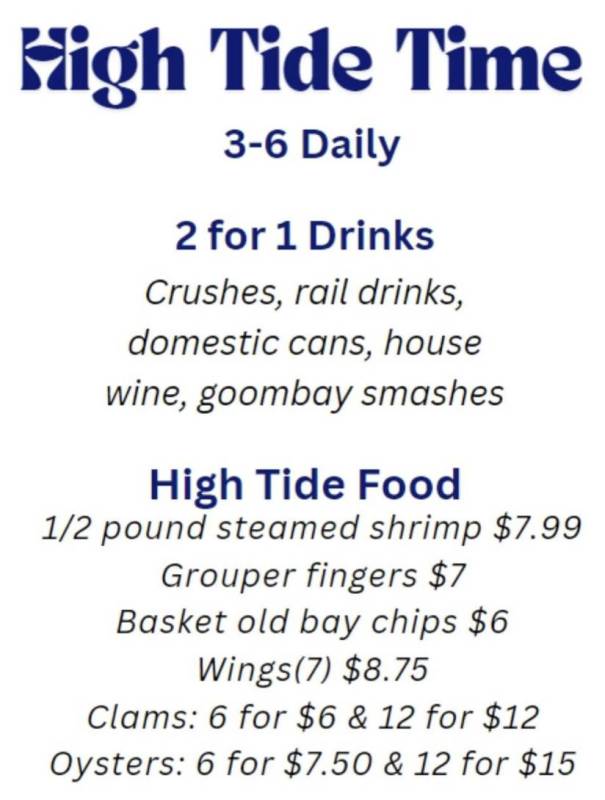 Don’t miss High Tide Happy Hour! Every Wednesday through Sunday from 3-6pm, enjoy 2-for-1 drinks. (They’ll even bring you a bucket of ice to keep that second drink frosty.)