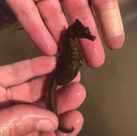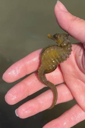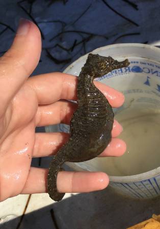 During the summer months, the Maryland Coastal Bays Program has the pleasure of running weekly seining programs for both educational and scientific purposes. This past June, we caught one of my favorite creatures, a lined seahorse! Seahorses are not caught as consistently as many of the regulars we see while seining, so this was a rare and exciting catch. Also called Northern seahorses, this species dwells among patches of submerged aquatic vegetation (SAV) in the summer months and then moves out to deeper water in the winter. They are notoriously weak swimmers, so their survival depends on their excellent camouflaging ability to conceal from predators.