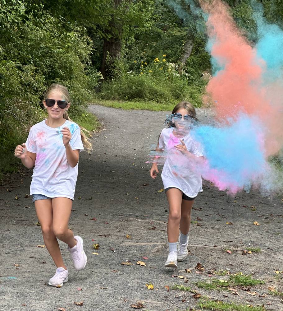 During a color run, a popular family event around the country, runners and walkers wear white tee shirts at the start of the race or walk. As they maneuver the course around the pond, they will be doused in a rainbow of colored powder, a different color at each point along the course. Participants finish the race plastered in bright colors. The colors and non-toxic chalk, safe on the skin and for the environment, and simply wash off.