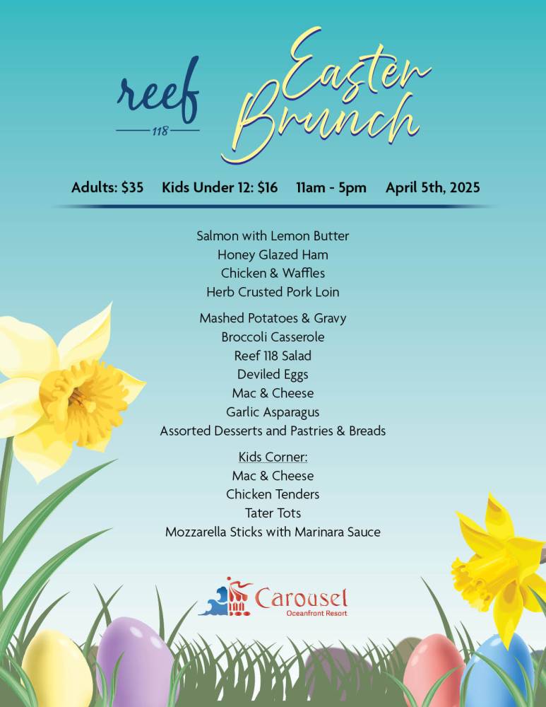 Book Easter Brunch with Reef 118 at the Carousel Hotel – Available 11am – 5pm. Book your stay here and join them for Easter egg hunts and a FREE photo with the Easter bunny Saturday and Sunday.