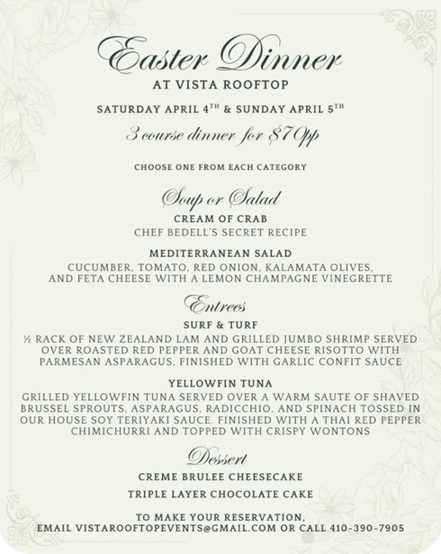 For a more traditional Easter feast with an upscale touch, Captain’s Table delivers. Known for its refined dining experience, their Easter buffet blends coastal favorites with holiday classics. It’s a great option for families who enjoy traditional Easter flavors with a coastal twist. Make your reservation through OpenTable or call 410-289-7192. $55 for adults, $20 for kids ages 6–12, and free for children 5 and under.