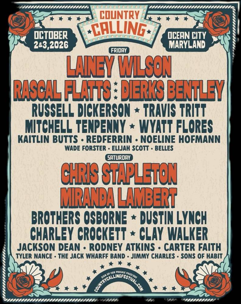 The Country Calling Festival is a 2-day country music event held in Ocean City, Maryland, on October 2-3, 2026, featuring over 25 artists on 3 stages. Enjoy food, boardwalk businesses, and the Jolly Roger amusement park. We will continue to update the page as more details are released.