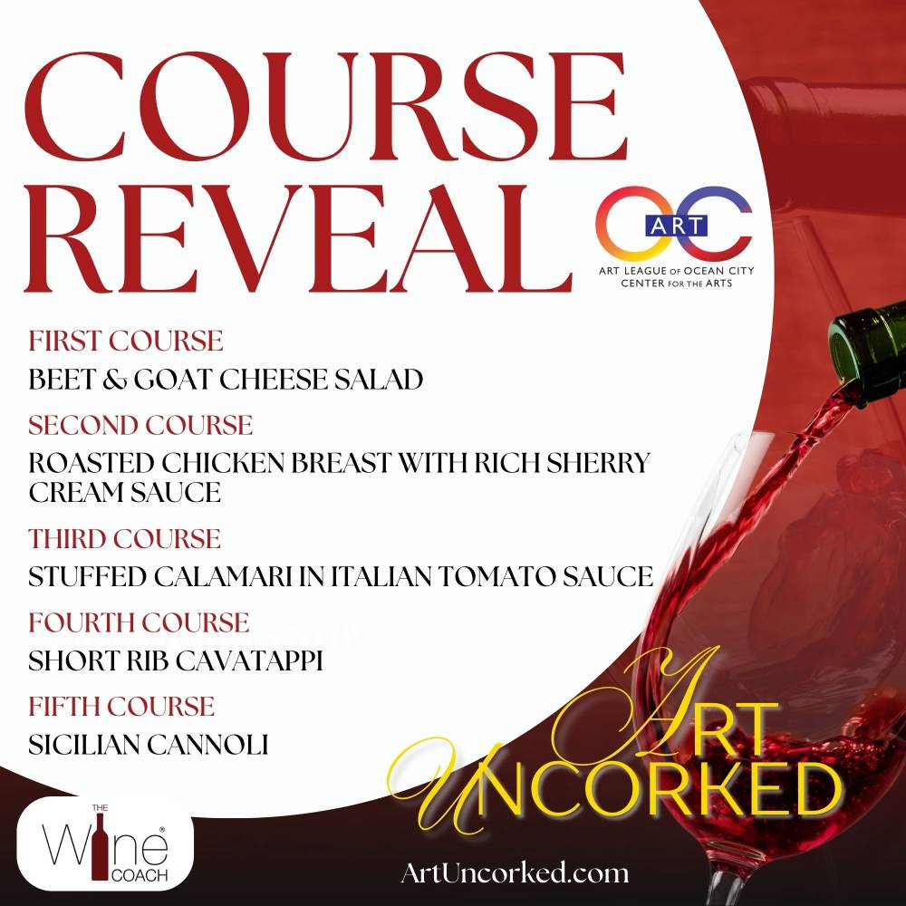 Throughout the evening, masterpieces will be unveiled—each work of art thoughtfully paired with a featured wine to highlight how artistic expression and wine can beautifully complement one another. These inspired pairings will be part of a silent auction that will culminate at the end of the evening, with proceeds supporting the Art League of Ocean City and its mission to nurture creativity in our community.