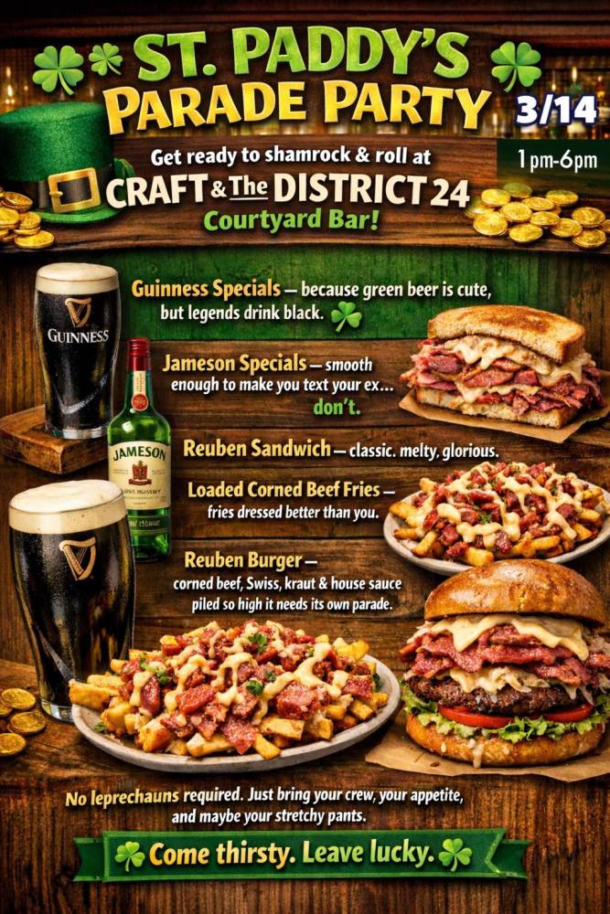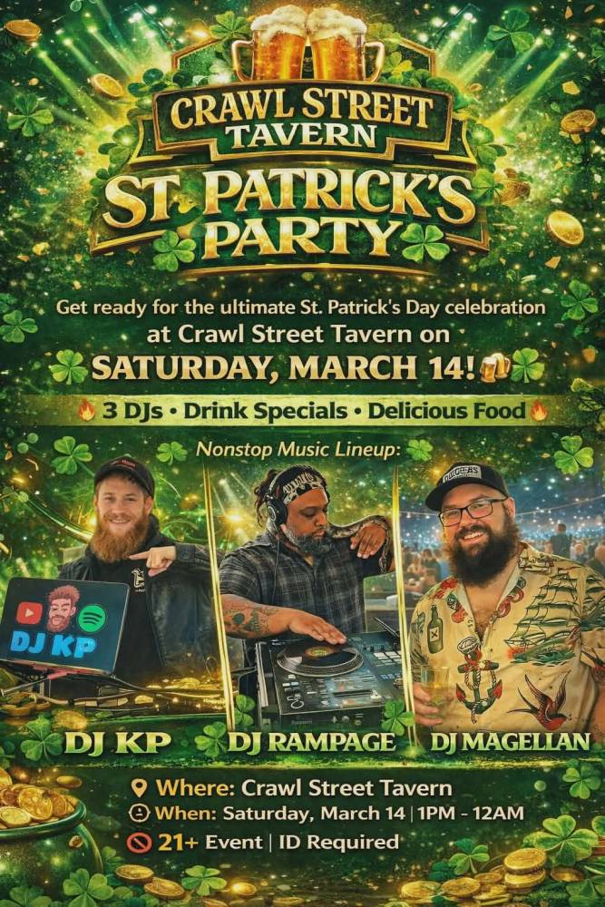 Get ready for the ultimate St. Patrick’s Day celebration at Crawl Street Tavern on Saturday, March 14! 3 DJs, drink specials, delicious food and nonstop music lineup: