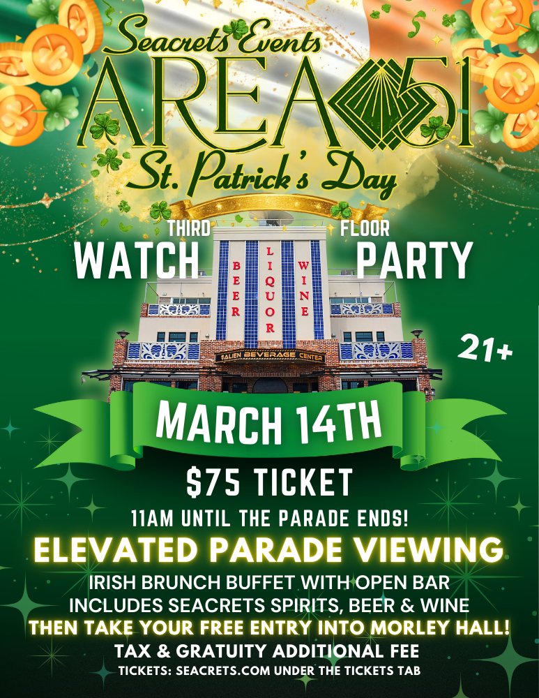 Ready to celebrate St Patrick’s Day in Ocean City Md? Watch the parade in comfort from Seacrets Area 51, on the third floor of the Atlantic Beverage Center, and enjoy an Irish brunch buffet and open bar at just $75 per person. Entry into Morely Hall afterwards also included.