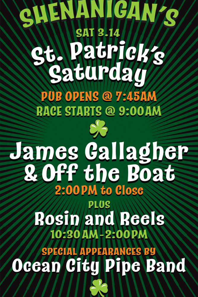 The St. Patrick’s Day 5K is a fun event for those who want to stay active on St. Patrick’s Day. The 5K race on March 14th will start on the Ocean City MD Boardwalk on 4th Street at 9am directly behind Shenanigans Irish Pub. The course will start running south toward the inlet, around pier, then down under the white tram station making a 180 degree turn back on the boardwalk heading north, past Shenanigans starting area, up to 16th st, then making another 180 degree turn heading south once again down the boards to the finish line at 4th st. Join in or cheer them on, and don’t forget to dress up in green and other festive attire!
