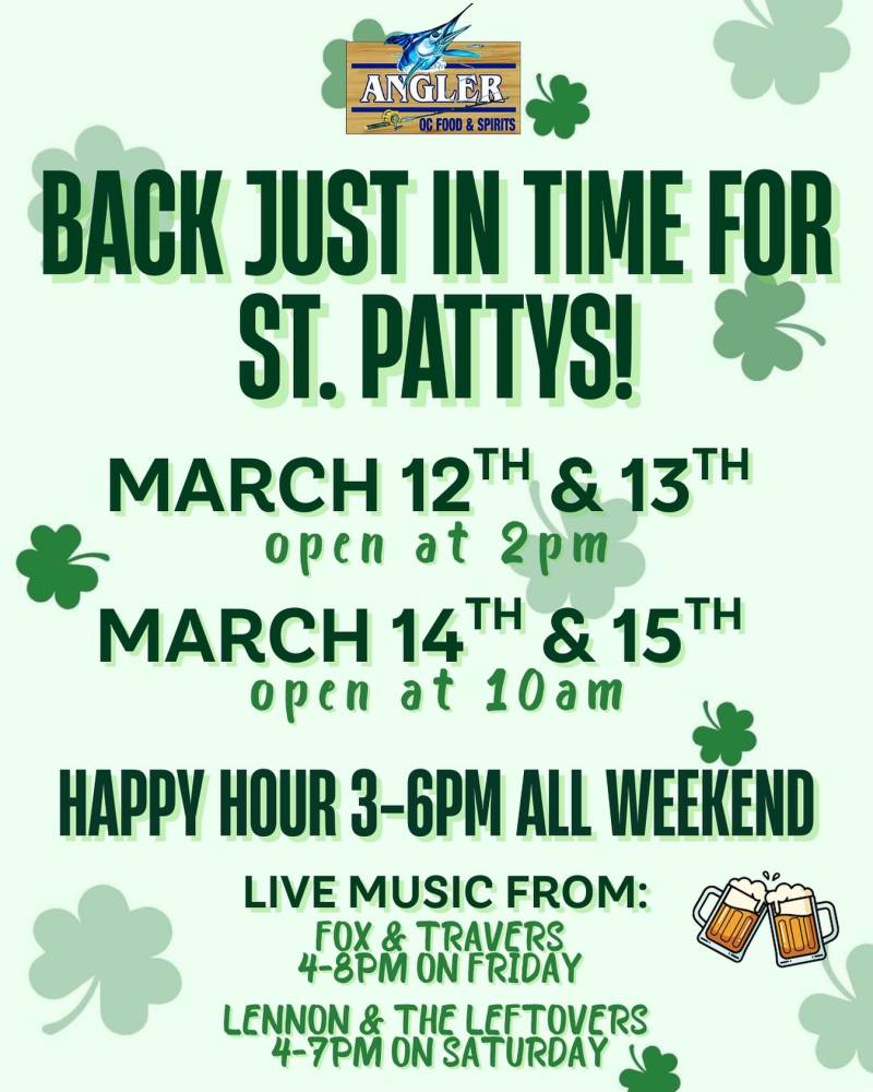 The Angler Restaurant and Bar is back for St. Patrick’s Day Weekend! Join them March 12th & 13th opening at 2PM. March 14th & 15th opening at 10AM. Happy Hour 3–6PM all weekend. Live music, cold drinks, and all the Irish vibes you can handle.
