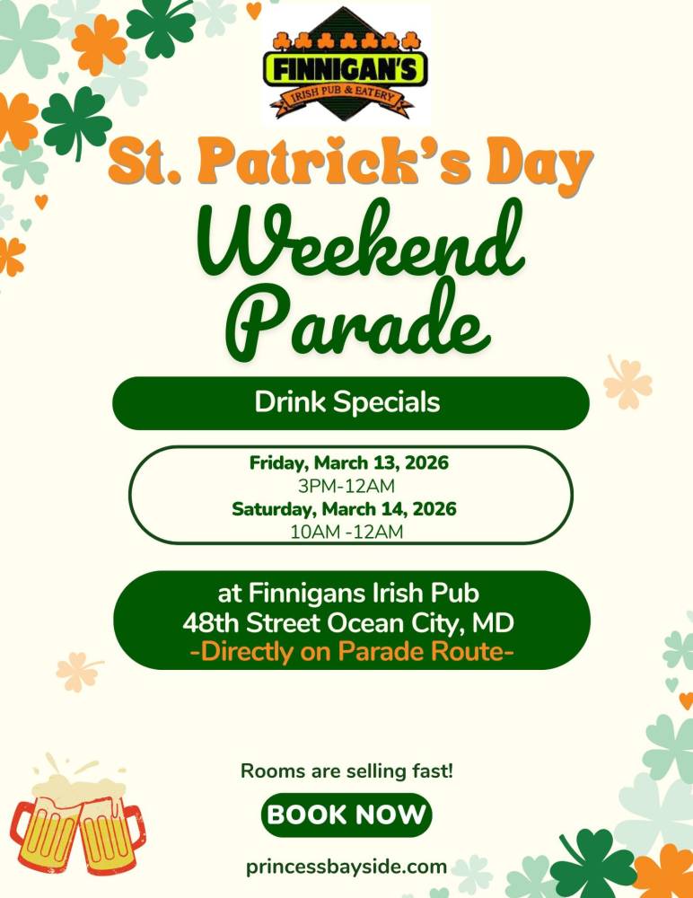 Celebrate with drinks and Irish cheer at Finnigan’s Irish Pub at the Princess Bayside, open Friday and Saturday, then step outside and catch the Ocean City St. Patrick’s Day Parade right along the route. Stay in the middle of the celebration at Princess Bayside Beach Hotel