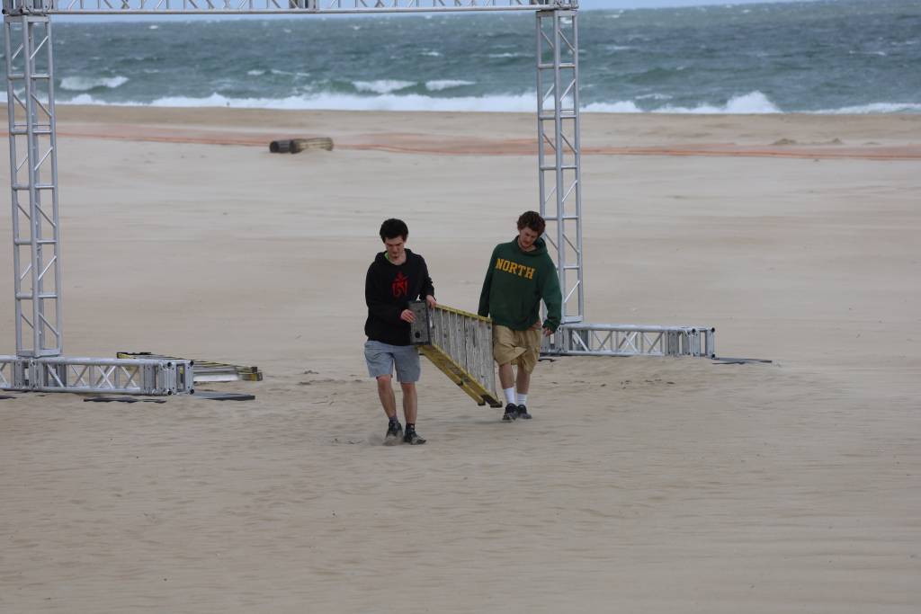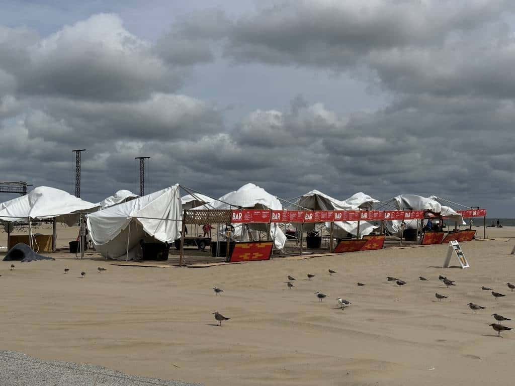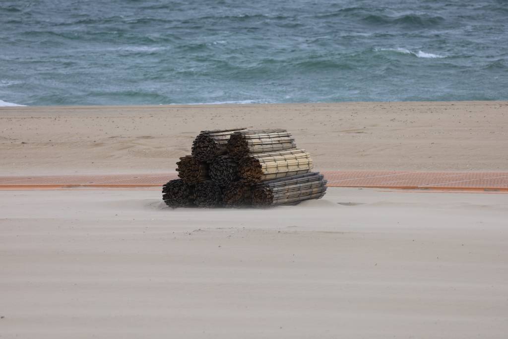 Town workers still trying to prepareTired birds resting on the beach.Flags still flying on the pierFencing lays in rolls