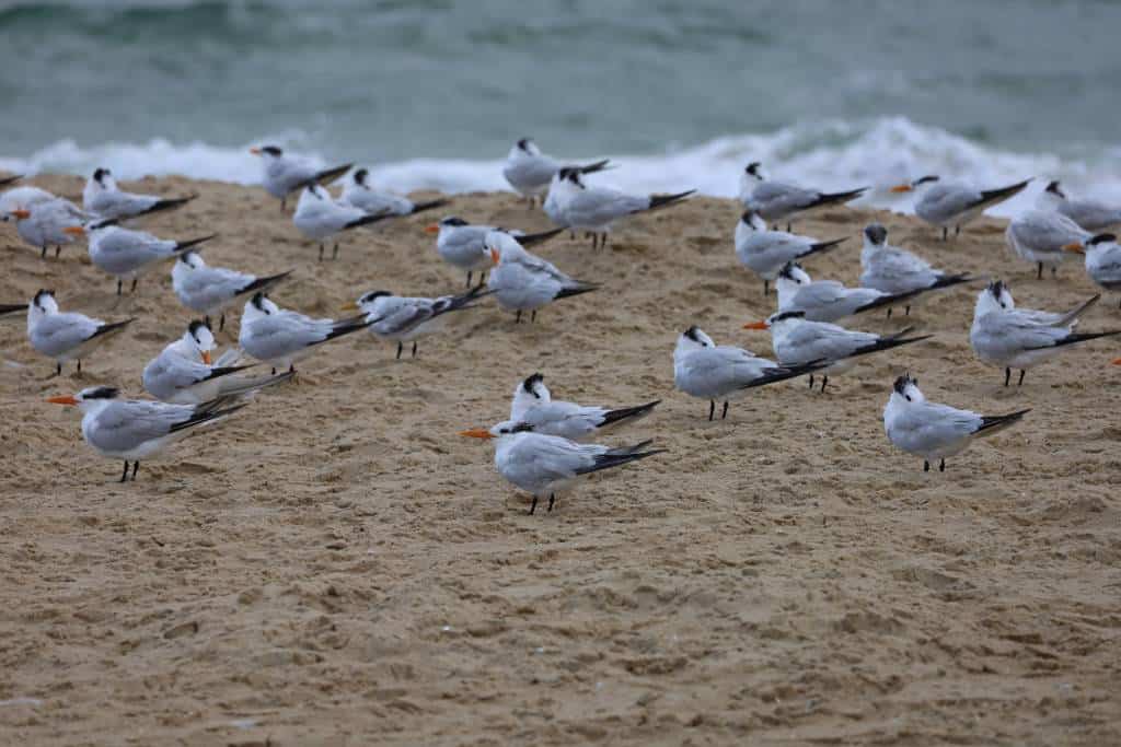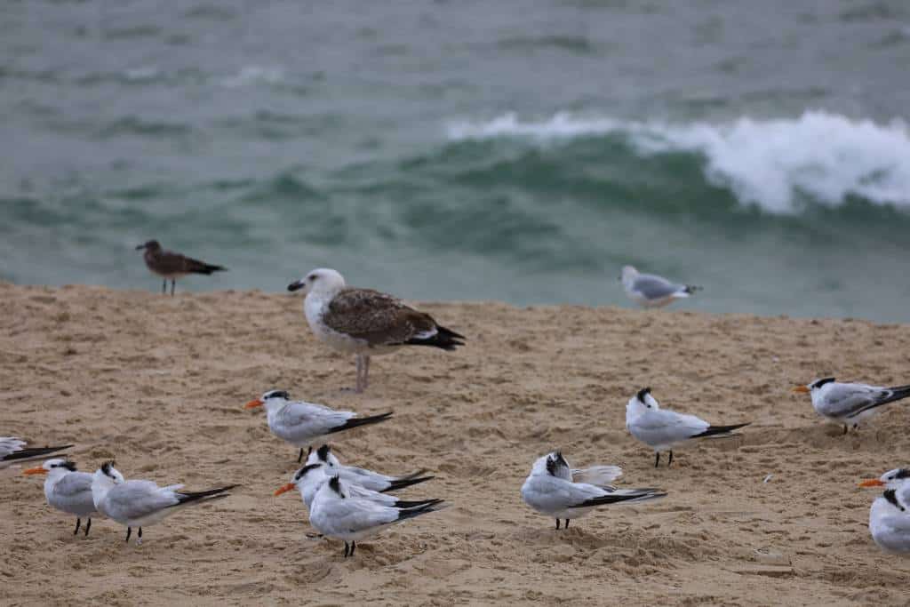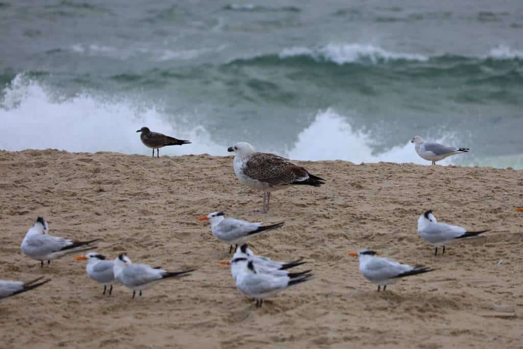 Tired birds resting on the beachThe inlet stage is coming downStorms impact birds tooShoveling sandIt takes a villageFlags still flying on the pierFencing lays in rolls