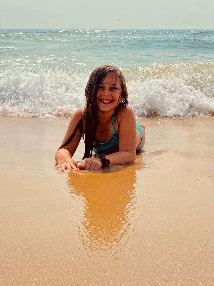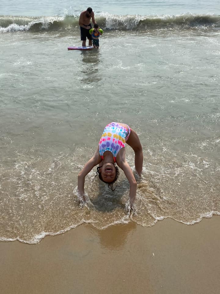 Gretchen Santa Lett – Enjoying practicing her gymnastics in the ocean! While her brother worked on his boogie boarding skills!
