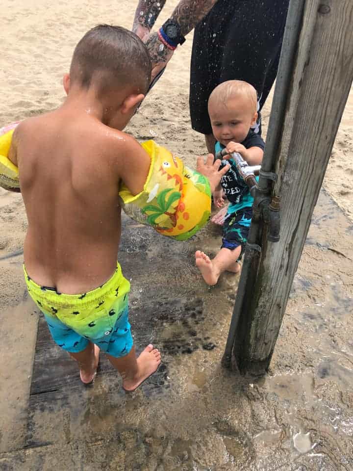Rachel Harper – My boys rinsing the sand off at ocean city boardwalk! Butt hanging out and all