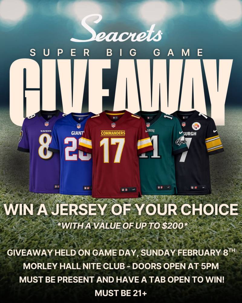 Want to watch the Super Bowl with fellow followers and a great atmosphere? Watch the Super Bowl on Seacret’s largest screen inside Morley Hall Nite Club, and enter to WIN a jersey of your choice (valued up to $200)! Doors open at 5PM. Come early, grab a seat, and enjoy wall-to-wall football plus game-day food & drink specials.