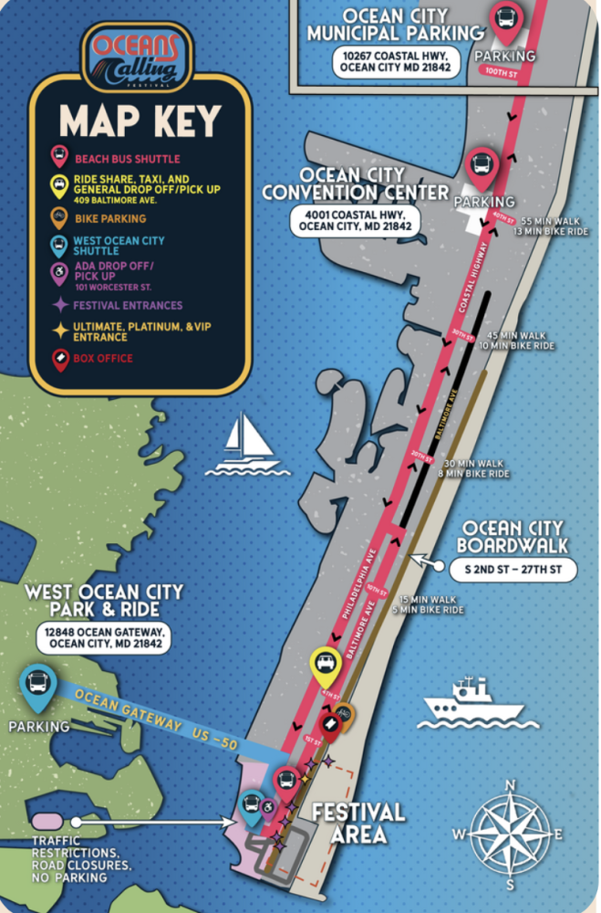 Here is your parking and transportation guide for the 2025 Oceans Calling Festival to help you plan ahead so you can minimize uncertainty, anxiety and frustration.  Remember, “Ocean City is a barrier island with only three ways on and off the island.  This means during special events that attract large amounts of visitors to the island; it’s a given that there are significant traffic and crowd issues.